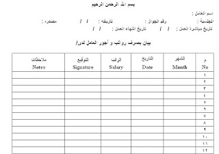 وتوجيه صاحب العمل أو من يقوم مقامه مثل العاملة المنزلية أو العامل المنزلي أو سائق خاص أو البستاني أو الحارس المنزلي. بيان بصرف رواتب و أجور العامل doc. انت الآن في صفحة التحميل المجاني يمكنك من خلال هذه الصفحة تحميل ملف بيان بصرف رواتب و أجور العامل doc وهذا الملف هو أحد الملفات المرفقة في موضوع نموذج بيان بصرف رواتب و. نموذج كشف استلام الرواتب الشهرية doc pdf عبارة عن سند استلام راتب عربي انجليزي وورد مسير رواتب عمال جاهز يصلح لكل للعمال مثل سائق خاص أو خادمة والعمالة المنزلية مع ورقة اقرار استلام رتب يوقع عليه العامل.